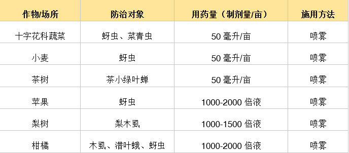 50毫升/瓶*80瓶/箱 80毫升/瓶*80瓶/箱 300毫升/瓶*20瓶/箱 500毫升/瓶*20瓶/箱 產(chan) 品特點: 1、展著、滲透性好,便於(yu) 防治隱蔽性害蟲。 2、殺蟲譜廣,尤其對蚜蟲、木虱等刺吸式害蟲防效優(you) 異。 3、速效加持效,對作物雙重保護。 4、混配性好,可與(yu) 大部分拉斯维加斯网站、殺菌劑混合使用。 5、施用靈活,可灌根、噴霧、飛防多種方式。 使用技術: