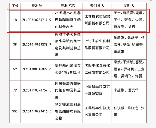 在1,004項中國專(zhuan) 利獎中,拉斯维加斯网络平台的“2-氰基-3-氨基丙烯酸酯衍生物的製備方法”、上海生農(nong) 生化製品股份有限公司的“防治十字花科蔬菜小菜蛾的組合物及其製劑和應用”、沈陽中化農(nong) 藥化工研發有限公司的“吡唑基丙烯腈類化合物及其應用”、中國科學院南京土壤研究所的“抑製番茄青枯病的組合物及其應用”、江蘇輝豐(feng) 生物技術有限公司的“包含噻苯隆和聚穀氨酸的農(nong) 藥組合物”等農(nong) 藥、植保項目被授予“第二十三屆中國專(zhuan) 利優(you) 秀獎”。