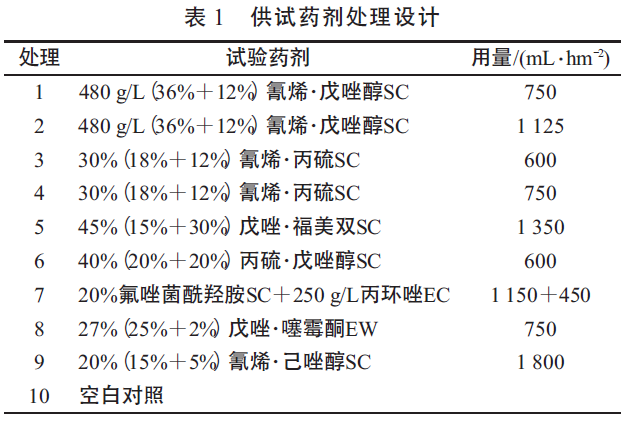 施藥器械為(wei) 英達電動噴霧器3WBD-20型,工作壓力為(wei) 0.15~0.40Pa,噴液量為(wei) 450kg/hm2,噴霧均勻,試驗期間未使用其他殺菌劑。