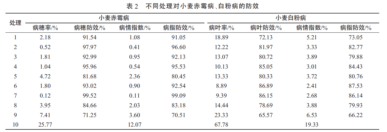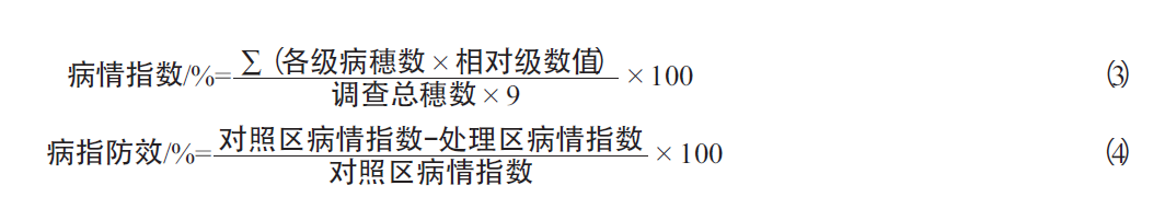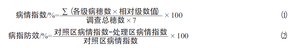 於(yu) 病情穩定期(2020年5月28日)調查各小區發病情況。每小區對角線五點取樣,每點調查相連1000穗,計5000穗。以發病小穗占全穗的百分率來分級,記錄各級病穗數,分級標準以及數據處理方法參照農(nong) 業(ye) 部農(nong) 藥檢定所編寫(xie) 的《農(nong) 藥田間藥效試驗準則》,按式(1)、(2)計算病情指數和病指防效。分級標準為(wei) 0級:全穗無病;1級:感病穗麵積占全穗麵積的1/4以下;3級:感病穗麵積占全穗麵積的1/4~1/2;5級:感病穗麵積占全穗麵積的1/2~3/4;7級:感病穗麵積占全穗麵積的3/4以上。