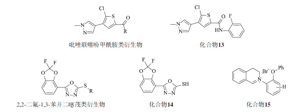 李安邦等將噻吩環引入吡唑酰胺類殺菌劑的骨架中,設計並合成了24個(ge) 吡唑聯噻吩甲酰胺類衍生物(圖4),並對其抑菌活性進行研究。生物活性測試結果表明化合物13對小麥赤黴病菌的EC50為(wei) 28.9 μmol/L,對小麥赤黴病病菌抑製率為(wei) 88.7%,並且對草莓灰黴病、水稻紋枯病和馬鈴薯早疫病病菌有較好的抑製率。王維等基於(yu) 活性亞(ya) 結構拚接原理,將1,3,4-噁二唑與(yu) 2,2-二氟-1,3-苯並二噁茂結合,合成了9個(ge) 結構新穎的2,2-二氟-1,3-苯並二噁茂類衍生物,其中化合物14在100 mg/L下對小麥赤黴病菌、蘋果樹腐爛病菌和番茄灰黴病菌的抑製活性為(wei) 100%。左懷龍等將二苯醚結構單元引入3,4-二氫異喹啉母核中,設計合成了15個(ge) 新型的異喹啉衍生物,其中化合物15對小麥赤黴病菌的抑菌率為(wei) 83.3%,遠優(you) 於(yu) 血根堿(64.2%)和百菌清(57.7%)。同時對油菜菌核病菌、水稻紋枯病菌等有較好的抑製作用。