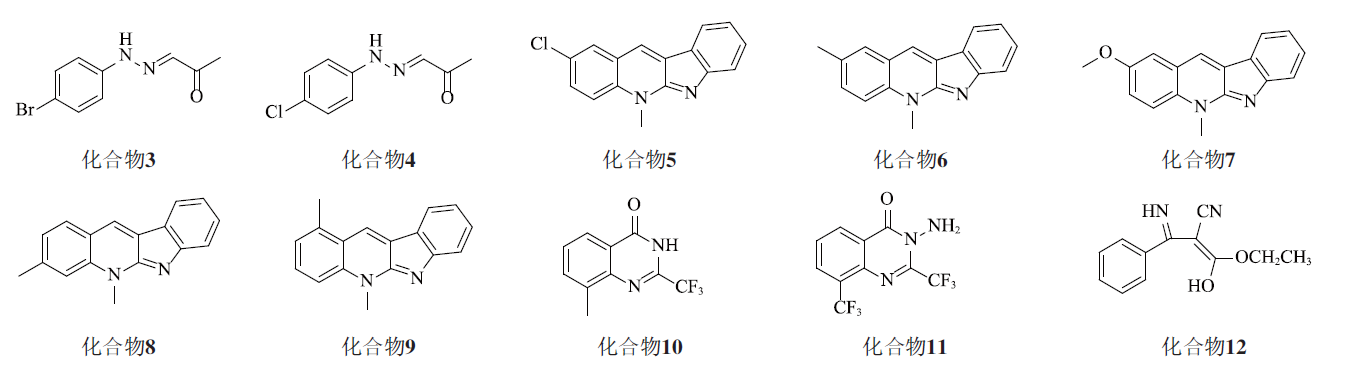 華中師範大學專(zhuan) 利CN107372496A公布了苯肼基酮類化合物3和4,當濃度為(wei) 20 mg/L時,對小麥赤黴病的抑製率分別達85.4%和93.9%。蘭(lan) 州大學專(zhuan) 利CN109717198B和CN110447651B分別公布了新白葉藤堿衍生物和喹唑啉酮類化合物。專(zhuan) 利CN109717198B中的化合物5、化合物6、化合物7、化合物8和化合物9對小麥赤黴病有優(you) 異的抑製率,顯著優(you) 於(yu) 嘧菌酯,當濃度為(wei) 50 mg/L時,對小麥赤黴病菌的抑製率分別為(wei) 95.98%、100.66%、99.98%、91.27%和90.46%;當濃度為(wei) 25 mg/L時,對小麥赤黴病的抑製率分別為(wei) 87.74%、99.98%、95.75%、84.68%和88.06%。專(zhuan) 利CN110447651B中的化合物10和11在濃度為(wei) 50 mg/L時,對小麥赤黴病抑製率超過85%。江蘇省農(nong) 藥股份有限公司報道了(Z)-3-亞(ya) 氨基-1-丙烯醇類化合物12對小麥赤黴病菌的抑製率達100%,田間病指防效達89.62%,顯著優(you) 於(yu) 常規藥劑多·酮可濕性粉劑,而且顯著降低小麥籽粒中DON毒素。