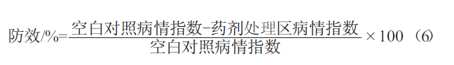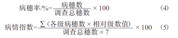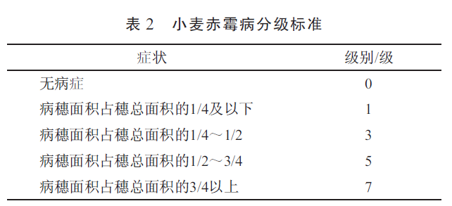藥後22 d(5月3日)進行調查,每個(ge) 小區隨機調查3個(ge) 點,按照不同分級標準記錄穗數,根據病穗率與(yu) 發病嚴(yan) 重度計算病情指數,根據病情指數計算防效。小麥赤黴病嚴(yan) 重度按照0、1、3、5、7分級標準,詳情見表2。病穗率、病情指數和防效分別按式(4)、(5)和(6)計算。