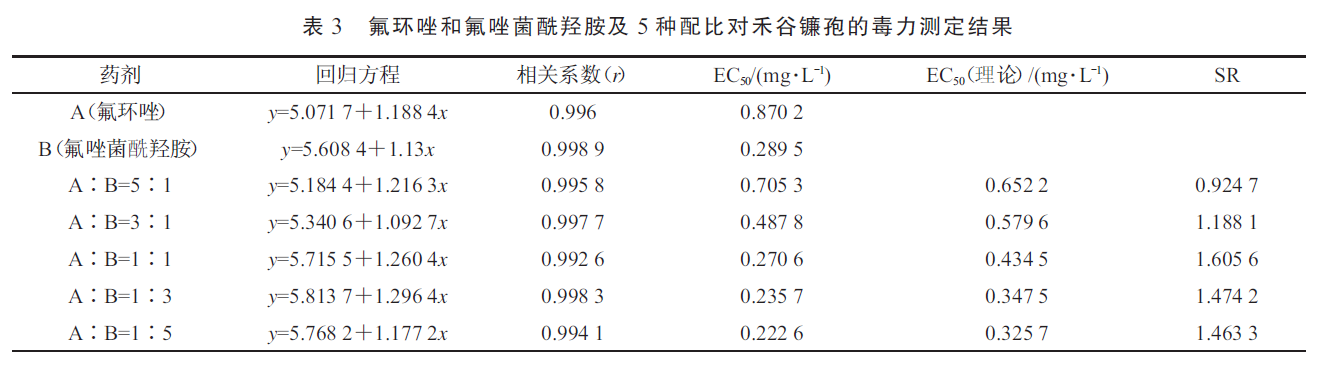 式中:a、b是各組分在混劑中含量比例,EC50(A)、EC50(B)分別表示氟環唑和氟唑菌酰羥胺單劑的EC50值。根據SR值分析混配的效果,SR≤0.5,則2種藥劑混配有拮抗作用;SR=0.5~1.5,則2種藥劑混配有加和作用;SR≥1.5,則2種藥劑混配有增效作用。