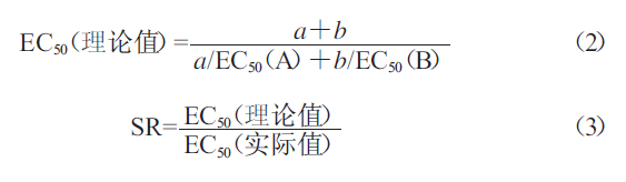 將菌絲(si) 生長抑製率換算成抑製機率值(y),藥劑濃度換算成濃度對數(x),按濃度對數為(wei) 橫坐標、機率值為(wei) 縱坐標作毒力回歸直線,求得不同藥劑對小麥赤黴病菌的毒力回歸方程,並計算EC50及相關(guan) 係數r值。根據Wadley方法評價(jia) 混劑的相互作用,按式(2)和(3)計算EC50(理論值)和協同增效係數(SR)。