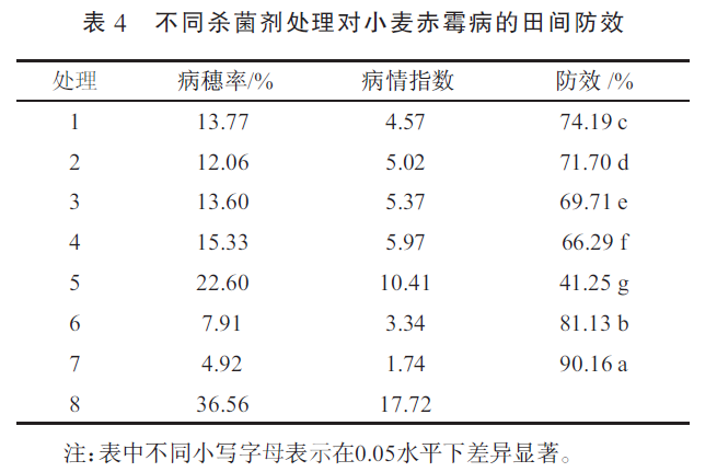 從(cong) 表4可知,該區域小麥赤黴病發病嚴(yan) 重,空白對照區域的病穗率達到36.56%,病情指數為(wei) 17.72。不同藥劑處理對小麥赤黴病均具有一定的防效。不同單劑處理中,在有效劑量都為(wei) 180 g a.i./hm2時,45%咪鮮胺OD防效較差,為(wei) 41.25%;20%氟唑菌酰羥胺SC和12.5%氟環唑SC單劑防效較好,分別為(wei) 74.19%和71.70%;30%丙硫菌唑OD和25%氰烯菌酯SC防效分別為(wei) 69.71%和66.29%,且不同處理間防效差異顯著。將12.5%氟環唑SC和20%氟唑菌酰SC按照有效濃度折算成質量比為(wei) 1∶1進行混配,即單個(ge) 劑型的有效劑量為(wei) 90 g a.i./hm2,複配後在總有效成分施用量同樣為(wei) 180 g a.i./hm2的情況下,其對小麥赤黴病的防效顯著高於(yu) 單劑,為(wei) 81.13%。進一步將單個(ge) 成分有效劑量提升到120 g a.i./hm2,按照質量比為(wei) 1∶1進行混配後總的有效使用劑量為(wei) 240 g a.i./hm2,其防效進一步提升,可達90.16%