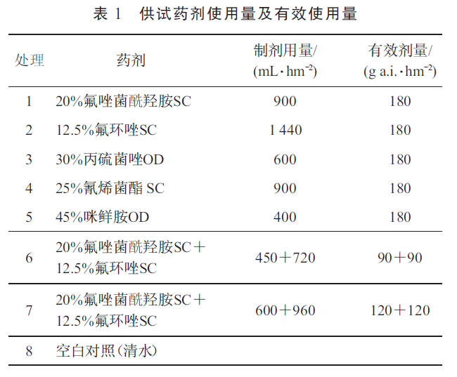 供試藥劑:20%氟唑菌酰羥胺SC,先正達公司;12.5%氟環唑SC,巴斯夫作物保護有限公司;30%丙硫菌唑OD,安徽久易農(nong) 業(ye) 股份有限公司;25%氰烯菌酯SC,拉斯维加斯网络平台;45%咪鮮胺OD,南京華洲藥業(ye) 有限公司。