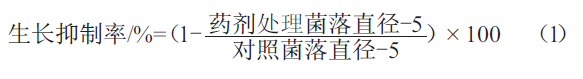 取測試藥劑,按照有效成分折算成一定質量濃度梯度:0.05、0.1、0.2、0.4、0.8、1.6、3.2和6.4 μg/mL。使用PDA培養(yang) 基(馬鈴薯20.0 g、葡萄糖20.0 g、瓊脂20.0 g、蒸餾水1 000 mL定容),將活化的菌株用打孔器製取5 mm直徑的菌絲(si) 塊,分別移到含有供試藥液培養(yang) 基平板上,於(yu) 25℃培養(yang) 。待空白對照的菌落直徑達到培養(yang) 皿直徑的90%左右,采用十字交叉法測量菌落直徑,按式(1)計算菌絲(si) 生長抑製率。