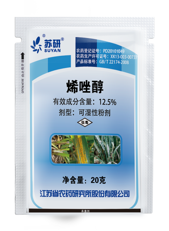 烯唑醇是三唑類殺菌劑,在真菌的麥角甾醇生物合成中抑製14α-脫甲基化作用,引起麥角甾醇缺乏,導致真菌細胞膜不正常,最終真菌死亡,持效期長,具有預防、治療、鏟除作用。